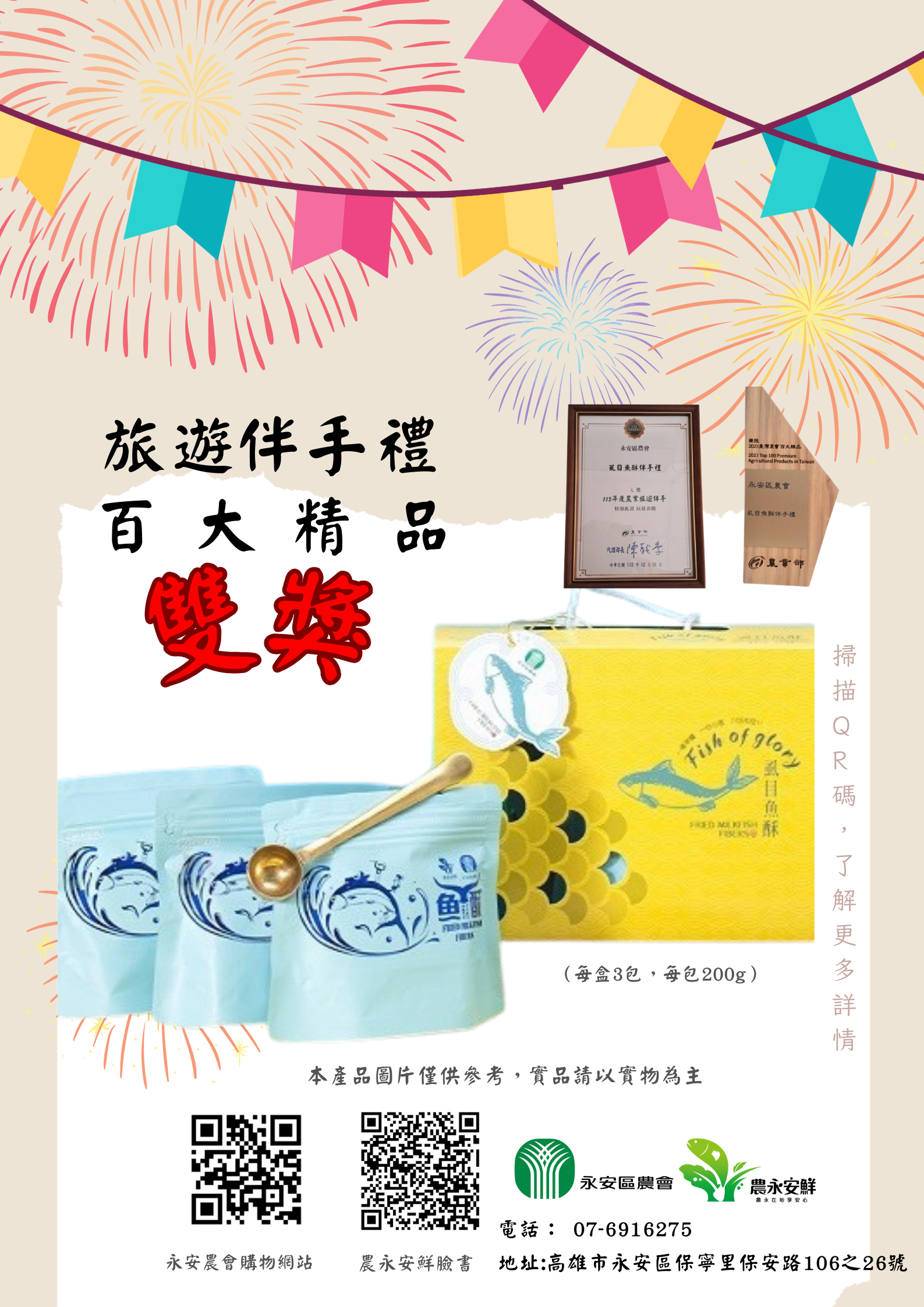 【永安區農會虱目魚酥輕巧禮盒】每盒3包入(每包200g),採用輕巧包裝形式販售,擺脫傳統因單一大包裝食用的不方便性。