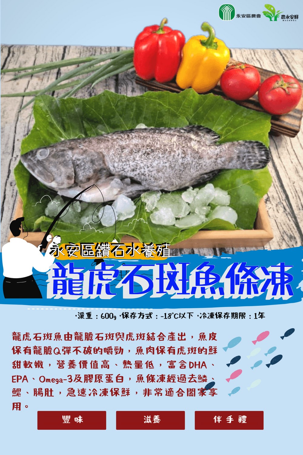 - 【龍虎石斑魚特色】:豐味、滋養、伴手禮 由龍膽石斑與虎斑結合產出,魚皮保有龍膽Q彈不破的嚼勁,魚肉保有虎斑的鮮甜軟嫩,營養價值高、熱量低,富含DHA、EPA、Omega-3及膠原蛋白,魚條凍經過去鱗、鰓、腸肚,急速冷凍保鮮,非常適合闔家享用。