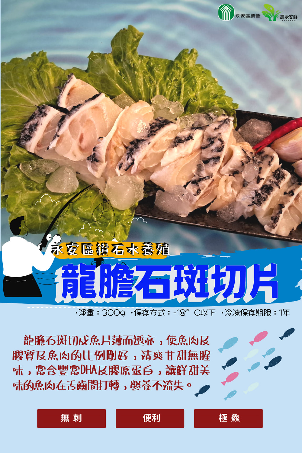 - 【龍膽石斑切片特色】:無刺、便利、極鱻 龍膽石斑切成魚片薄而透亮,使魚肉及膠質的比例剛好,清爽甘甜無腥味,富含豐富DHA及膠原蛋白,讓鮮甜美味的魚肉在舌齒間打轉,營養不流失。